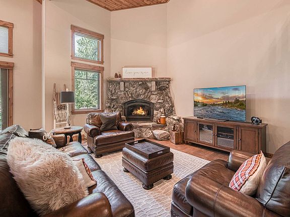The main living area sets the tone with soaring vaulted ceilings, exposed wood beams, and expansive windows that frame tranquil forest views. At the heart of the room is a dramatic floor-to-ceiling stone fireplace, creating a warm focal point for evenings spent with family and friends. A mix of plush leather seating, thoughtful decor, and natural light makes this space equally suited for curling up by the fire or enjoying a movie on the flat-screen TV.