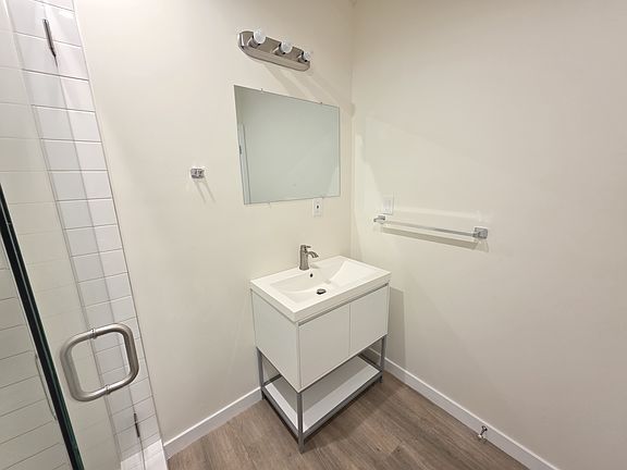 The sleek kitchen comes equipped with new white shaker cabinets, quartz countertops, and a full set of appliances including a refrigerator and gas range. The stylish bathroom features a frameless glass shower with modern tile and finishes.