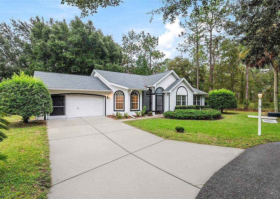 Welcome home to your little sanctuary tucked along the edge of a preserve, the Marjorie Harris Carr Cross Florida Greenway, where peaceful mornings and golden sunsets paint the backdrop of your days. This enchanting San Antonio floorplan residence sits gracefully on an comfortable .30-acre cul-de-sac lot, surrounded by nature and gentle breezes. Step inside to discover 3 spacious bedrooms, 2 bathrooms, and a 2-car garage, where comfort and elegance blend effortlessly. The kitchen offers abundant cabinetry, a cozy breakfast nook, and a view that makes every cup of coffee feel like a moment of escape. A formal dining room and sun-filled bonus room with sliding glass windows provide the perfect settings for gathering, relaxing, or simply enjoying the view. The primary suite invites serenity with its walk-in closet, updated step-in shower with glass doors, and a double-sink vanity. Throughout the home, thoughtful details abound—tray ceiling, glass block accents, recessed lighting, updated fixtures, and modern hardware that add a touch of refinement to every space. Outdoors, your fenced backyard opens to the beauty of the Preserve. Enjoy your own private 12x12 paver patio, perfect for quiet evenings under the stars or morning coffee while watching deer wander by. With a newer roof (2022), this home offers both charm and peace of mind. Life in Oak Run Country Club is rich with activity and community. Enjoy 6 swimming pools, 5 whirlpools, tennis and pickleball courts, a driving range, fitness centers, a library, craft and billiard rooms, and the Oak Room Bar & Grill restaurant. Oak Run also offers an 18-hole golf course and a variety of clubs to match every interest. With a state-of-the-art virtual guard system at the gates and a monthly service fee that includes trash pickup, yard debris, basic cable, and access to amenities, this community offers a lifestyle that’s as carefree as it is captivating. Set your appointment today to see this lovely home - this is the lifestyle you’ve been dreaming of.