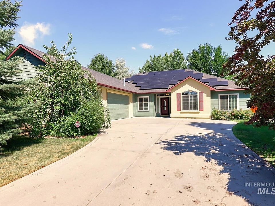 Seller is offering $10,000 towards interest rate buy down or closing costs with full price offer! Lovely "one owner" single level home in a great location. The open concept features vaulted ceilings and skylight tubes to let natural light in. Spacious kitchen w/tile counters, undermount lighting, walk-in-pantry, breakfast bar, refrigerator and newer dishwasher. Enjoy the formal dining/living room, the large eating nook opens up to the great room w/ gas fireplace. Split bedroom design 4 bedrooms/ 4th could be office opens up w"(glass double doors)Roomy large master bedroom-bath suite w/soaker tub, separate shower, large walk-in-closet and separate dual vanities. Hall bath has dual vanities. North facing backyard on corner lot with no back neighbors, fully fenced yard, waterfall feature, mature landscaping and patio access off great room and master. Large utility room with sink leads into the 3 car garage. Home faces south and owner had solar panels installed on the roof for cost saving energy!
