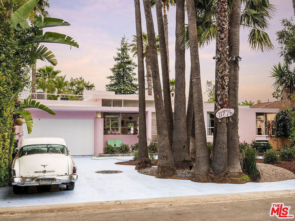 Presenting an excellent opportunity for the modern collector, Hollywood history buff, or developer/builder/end-user: An original portfolio piece by American architect William Kesling, known for designing a historic collection of homes in the Streamline Moderne style (a subtype of Art Deco aptly dubbed "ocean liner" style by the French) throughout Los Angeles. Given its close proximity to studios, there's no surprise that it was originally used as a party haven for Hollywood's tastemakers, but that was just the beginning. In 1980, this iconic residence was purchased by two-time Grammy-winning, Emmy- and Tony-nominated songwriter and art director Allee Willis, and the rest is nothing short of music history. Willis gave the architectural diamond its baby pink hue, but otherwise preserved its original identity while performing a complete restoration. Here, the former Motown Records dreamer would host lavish gatherings and themed jamborees which quickly became notorious throughout Hollywood's social circles, her exclusive guest list including the likes of Cher and Joni Mitchell. The home would also serve as the birthplace of her vast body of work, resulting in a long list of smash-hit songs such as "September" and "Boogie Wonderland" by Earth, Wind & Fire, "Neutron Dance" by The Pointer Sisters, and "I'll Be There for You," the indelible theme song of NBC's hit television show Friends. Over the years, she welcomed legendary recording artists and collaborators to the on-site state-of-the-art music studio (James Brown, Bob Dylan, and Cyndi Lauper are just a few). With an insatiable desire to create, she also sculpted and painted numerous art pieces. Willis was also an avid collector, adorning her home with countless pop culture treasures from the 1950s, '60s, '70s, and '80s. Of her penchant for throwing parties, Willis notably once said in an interview, "I always had a music career, an art career, set designer, film and video, technology. The parties really became the only place I could combine everything." Her storied festivities have been covered in publications as diverse as People, Life, The New York Times, The Wall Street Journal, and Rolling Stone. Beneath towering palms, the '50s-inspired grounds feature a bowling-ball garden, private sand beach, and newly built poolside shower for the modern reveler.