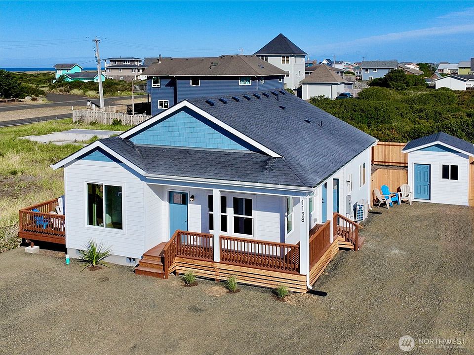 Charming Beach Cottage located a mere 6 parcels from a Beach Access Trail at Ocean Shores, Washington! Listen to the ocean from this new 1,074 sf plan featuring 2 bedrooms and 1.75 bathrooms, and a 10x12 shed for toys and tools. Enter into the great room with windows galore, vaulted ceilings, luxury vinyl plank flooring, and an electric fireplace with live-edge mantle. Spacious kitchen with Quartz counters, island/breakfast bar. Dining w/door to deck. Follow the hallway to the utility/mud room, full bathroom with tiled tub surround, sunny guest bedroom, and primary ensuite complete with a walk-in closet and a 3/4 bathroom with tiled shower surround. Wrap around deck and deck off of dining. Hot/cold spigot. Fenced back yard. 8,201 sf lot.