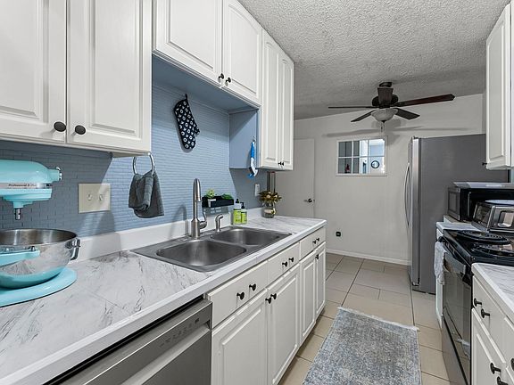 Modern white cabinetryStylish chandelierWood-burning fireplaceFenced patioLuxury plank floorsOpen floor planNew stainless appliances