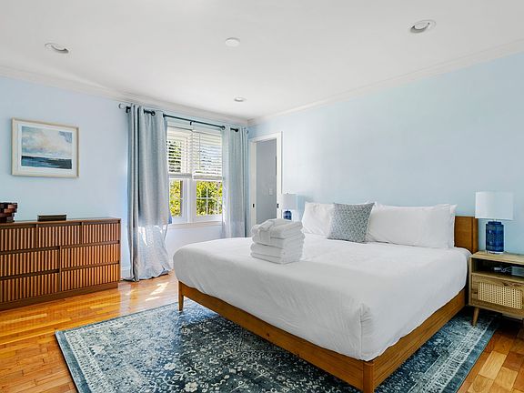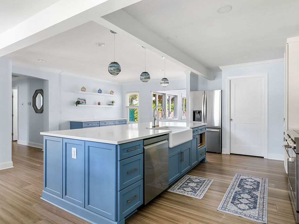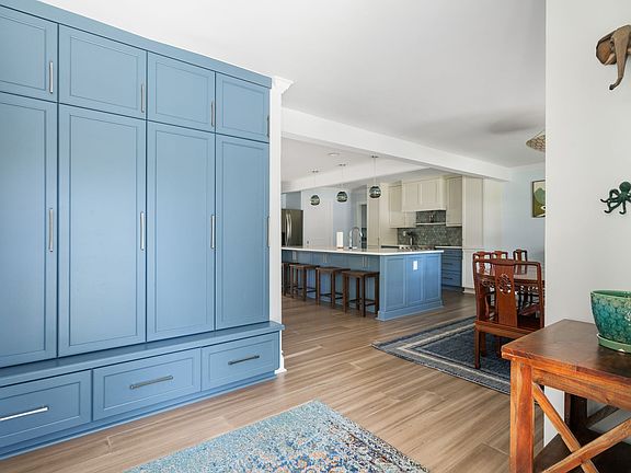 Step through the front door into a welcoming entryway with custom cabinetry designed for effortless organization- perfect for shoes, coats, and beach gear. Beyond the entry, you'll find a spacious open-concept kitchen and dining area. The kitchen features stainless steel appliances, a large island with seating for four, and abundant cabinet and prep space. The adjacent dining area offers a table for eight, ideal for family dinners or entertaining guests. A full bathroom is conveniently located off of the kitchen.