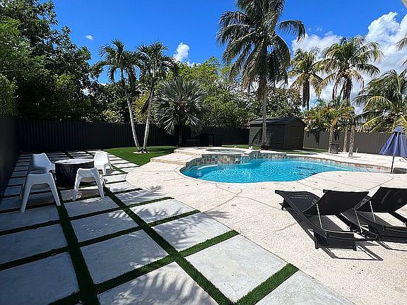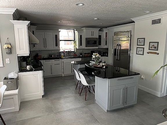 Beautifully, contractor designed and built custom home for sale. Completely remodeled in 2021-22 with updated solid wood kitchen cabinets, built-in appliances, new 32x32 tile throughout entire house, new baseboards and casings, updated impact windows and doors, brand new aluminum roof (2 weeks old), artificial turf throughout entire backyard around pool and spillover spa.