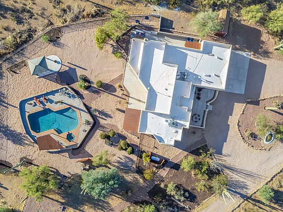 5+ acres, No HOA. Discover desert living at its finest in this gorgeous custom-built Santa Fe-style home, complete with a 665 sq. ft. casita, situated on 5+ acres bordering Tucson Mountain Park and Saguaro National Park. Enjoy panoramic views of saguaros, lush desert vegetation, and stunning sunrises and sunsets. The main house welcomes you with high ceilings, large windows that bathe the home in natural light, and a cozy living area with a wood-burning kiva fireplace. The updated kitchen features granite countertops, stainless steel appliances, and opens to the living space with viga beams and an airy feel. The split floor plan includes a spacious master suite and bedroom/office on one side, with two guest bedrooms & a bath on the other, perfect for privacy or flexibility. with two covered patios, a charming brick courtyard, and a pool/spa area with a covered ramadaideal for year-round enjoyment. The detached casita, nestled just far enough for privacy, is perfect for an art studio, workshop, or guest house. It features concrete floors, a kiva fireplace, a kitchen with tile accents, a soaking tub, and its own laundry room. With uninterrupted desert and mountain views, this home is a private retreat where you can relax and connect with the natural beauty of the Southwest.