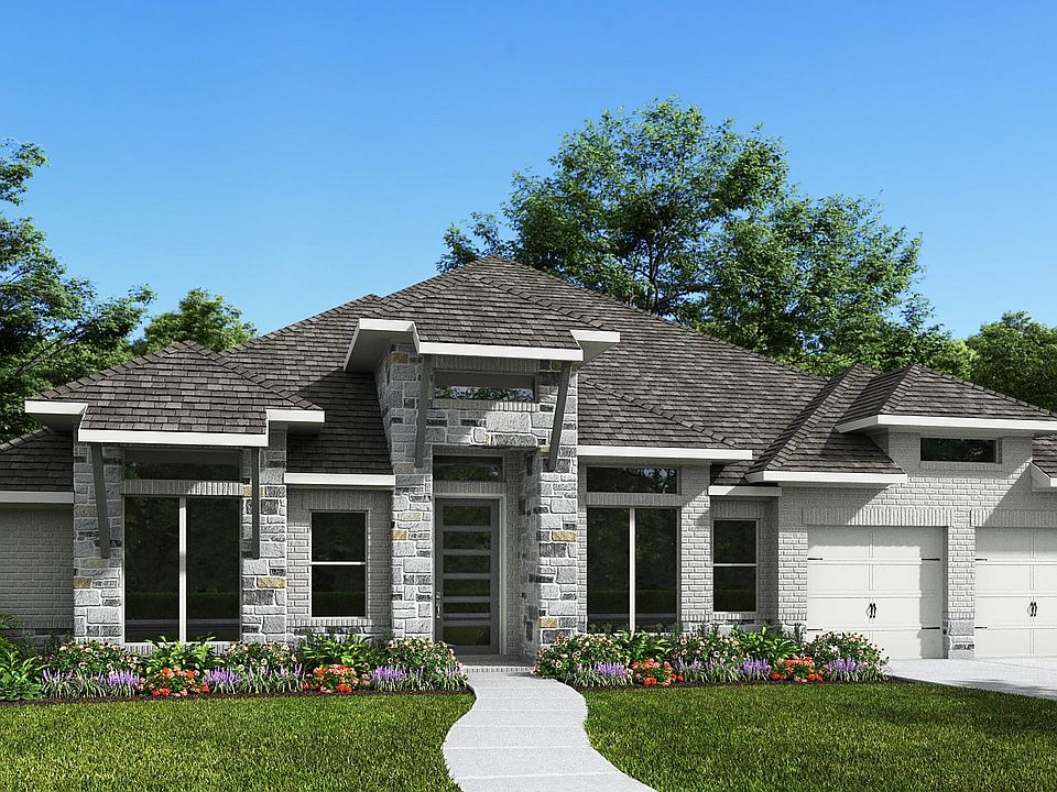 Home office with French doors sits off the entry. Formal dining room and game room with French doors frame the extended entry. Family room opens to morning area and kitchen, and features a wood mantel fireplace and sliding glass door that opens to the extended covered patio. The kitchen hosts an island with built-in seating, 5-burner cooktop, and double wall oven. The primary bedroom sits off the family room and features a wall of windows and the primary bath includes dual vanities, freestanding tub, separate glass-enclosed shower and large walk-in closets. All bedrooms feature private baths. Abundant closet space, high ceilings and large windows add to this generous design. Mud room leads to three-car garage.