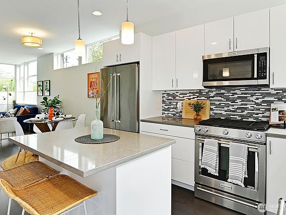 Sunlight streams through the open great room, where tall ceilings, gleaming hardwoods, & a handy half-bath set the stage for easy entertaining. The chef’s kitchen impresses w/ a center island, gas range, & stainless appliances. The top-floor primary suite is a private retreat w/ vaulted ceiling, a walk-in closet & balcony to enjoy the cherry blossoms. 2 additional bedrooms & a full bathroom share the second level. Built to exceed energy-efficiency standards, with ductless mini-splits, solar-panel conduits, on-demand hot water, and EV-charging wiring. A 96-walk score, excellent transit access, and off-street parking. This home offers a rare blend of tranquility & urban access. Sleek. Sustainable. Perfectly placed. No HOA. End Unit.