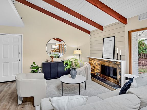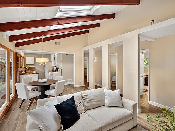 Perfectly situated on the border of Los Altos with easy access to both downtown Los Altos and Mountain View, this charming home boasts a fabulous great room design, light-filled bedrooms, fresh updates, and a private park-like yard. The open living spaces sit at the back of the home beneath soaring vaulted ceilings and feature a wall of windows overlooking the lush yard, a stacked stone fireplace, airy dining room, and a kitchen with stunning granite countertops. Three bedrooms have views of the front of the home, cedar-lined closets, and enjoy easy access to the hall bath. Outside, a magnificent pine tree provides shade to the freshly landscaped yard complete with manicured plantings, a large concrete entertaining patio, and level lawn for play. Entirely move-in ready, and close to wonderful amenities, acclaimed local schools, tech employers, and commute routes.