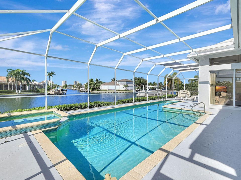 Experience breathtaking Southwest sunsets with captivating long water views. This light, bright, and solidly built furnished Divco home of 3-bedroom plus den, 2.5-baths is the perfect Marco Island escape— inviting, with sliders along the entire rear of the home and soaring 12ft ceilings designed for relaxed island living, year-round enjoyment, with an excellent rental history and continued potential. Ideally situated in a fantastic central location, you're equal distance from the beach, dining, Mackle Park, and the Collier Boulevard entertainment corridor, making this home as convenient as it is comfortable. A home with curb appeal and bright landscaping, you are greeted with an open-concept layout with a living, dining, and kitchen area that flow seamlessly. An open den area with wet bar or use as formal dining provides flexibility, while a sectioned room can serve as a kids' bunk space, study, or home office. The kitchen includes modern stainless-steel appliances (2022), abundant cabinetry, and counter space for easy entertaining with a full laundry room nearby. Recent improvements enhance every corner: new carpet, new furnishings, fresh paint inside and out (including roof and pool deck), a newer lawn, and a pavered driveway and walkway. Step outside to the 40-foot-long pool with lap lane and outdoor pool bath, surrounded by a large screened lanai perfect for BBQs, lounging, and family gatherings. Sensational vistas overlook an extra wide canal with a long view to the Winterberry Bridge, the setting feels private yet connected—an ideal backdrop for both relaxation and play. Offering the quintessential indoor/outdoor Florida lifestyle with 80ft. of waterfront, water indirect access to the Gulf, and plenty of room to add a dock for boating adventures. A rare opportunity to own a property that earns as beautifully as it entertains—schedule your showing while availability lasts.