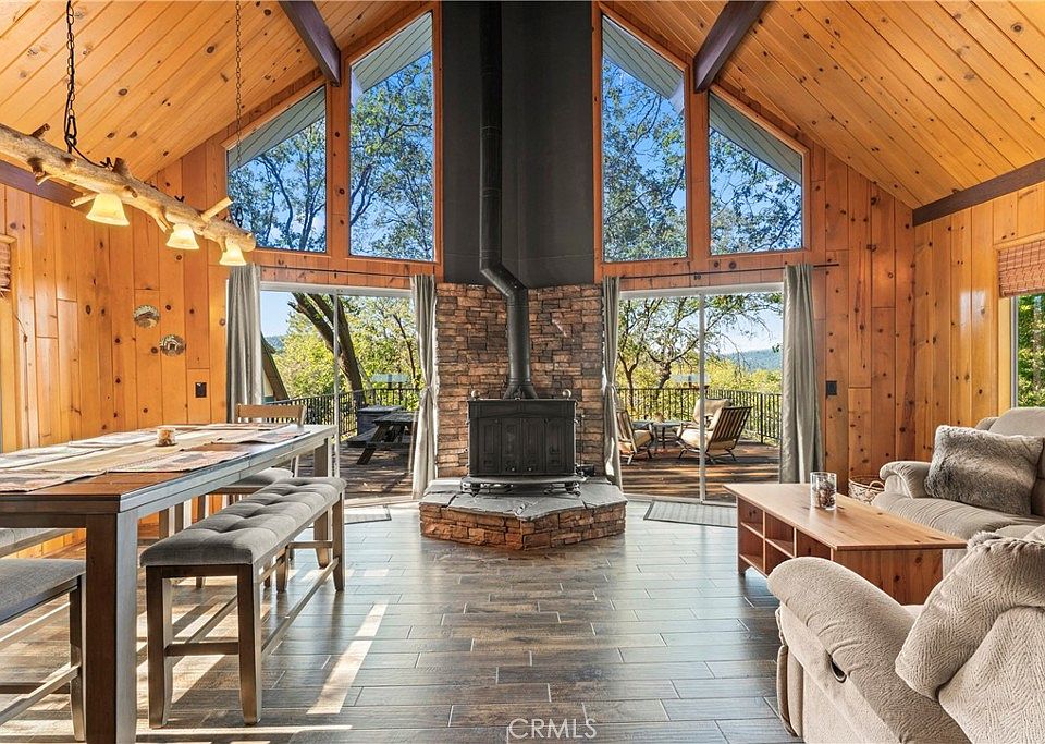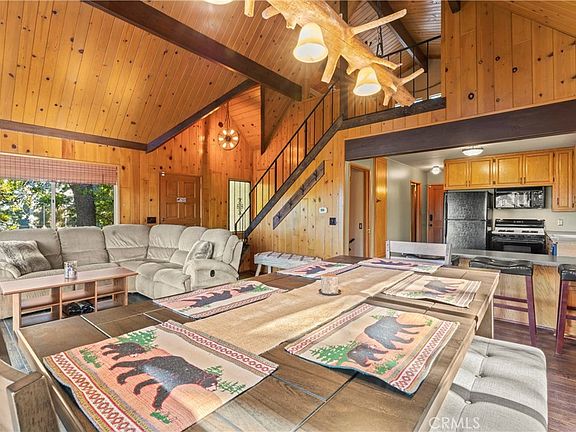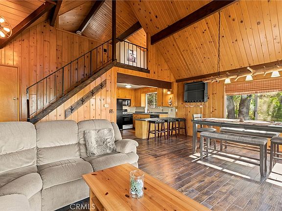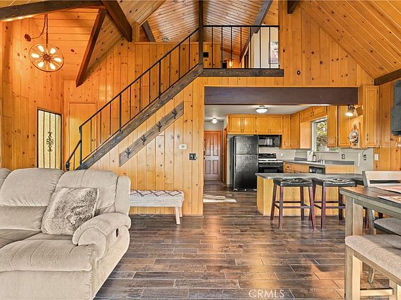 Location matters! A Frame Prow mountain retreat located in a prime location only 1.2 miles to Lake Arrowhead’s Tavern Bay Beach Club & National Forest hiking/off road trails right up the street! This move in ready 3 bedroom/2.5 bathroom, showcases Pride of ownership top to bottom(exterior recently professionally painted), with EASY ENTRY from a LEVEL concrete driveway. The accommodating floorplan offers a full bathroom and bedroom on the main living level. The front door enters directly into the beautiful living room boasting quality tongue and groove wood paneling, open beamed cathedral ceilings, and wood burning stove centered perfectly between floor to ceiling wall of glass. Kitchen open directly to the dining area and living room, ideal for hosting holiday gatherings. Quality engineered hardwood flooring throughout the entry level and upstairs bedroom. The upstairs bedroom en suite offers ample closet space, a cozy reading nook, and full bathroom boasting a soothing custom stone shower. Downstairs offers a spacious game room serving as a 3rd bedroom area with attached powder room bath, laundry room, and ample storage room. Plenty of usable outdoor space here via a large, covered concrete lower patio area with storage shed for the tools and toys. Host Summer BBQs on an oversized 27’x26’ entertainers deck perfectly positioned under a canopy of mature Black Oaks with gorgeous sunset views and Mt Baldy. Full lake rights to private Lake Arrowhead and move in ready condition make this a front runner of its price range. Just in time for holidays in the mountains, tour today!