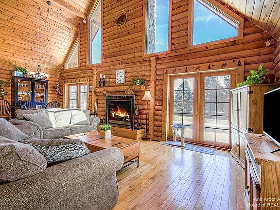 Gorgeous custom log home on 7 acres in Chelsea Schools! This incredible country home has 3 beds/2 full baths, open concept living w/soaring wood plank ceilings, large light filled windows & wood floors through 1st level. Living/dining space w/wood fireplace w/blower, 2 sets of French doors, & open to kitchen w/cooktop island, snack bar & double oven. 2 bedrooms w/large closets & full bath complete the first level. Upstairs French doors lead to huge primary suite w/vaulted ceiling, walk-in closet & bath w/jetted spa tub, shower & heated floor. Basement has large family room w/wood beam ceiling, refrigerator, closet space, office, laundry & huge storage room & plumbed for 3rd bath. Outside is beautifully landscaped, covered front porch perfect for sitting, covered back porch, large 2.5 car g garage w/2nd floor, matching she shed, pergola & above ground pool. Home also has wired speaker system & outstanding water quality. Located a short drive from downtown Chelsea & less than a 10th of a mile off M-52, close to the B2B and DTE trails, w/B2B trail planned to be extended to Boyce Rd this year. This outstanding log home property has the unusual combination of peaceful country living while having Lyndon Township High Speed Internet!, Primary Bath