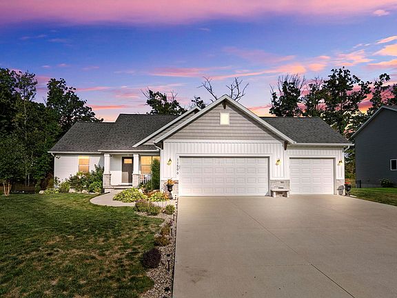 Nestled within the desirable Sessions Woods community, this charming ranch-style residence blends modern design with timeless comfort. Built in 2019 by Maplewood Homes, the property showcases high-quality craftsmanship, thoughtful details, and energy-efficient features, including 2’ x 6’ walls, spray foam insulation, and a superior foundation. Offering three bedrooms and two full baths across 1,437 square feet of single-level living space, the home presents a layout that feels both open and inviting. The great room, anchored by soaring vaulted ceilings, flows seamlessly into the kitchen and dining areas, creating an ideal setting for gatherings or relaxed daily living. A calming palette of whites, grays, and neutrals sets the tone for the interior, enhanced by laminate flooring and abundant natural light from insulated low-emissivity windows. The kitchen is highlighted, with white maple shaker cabinets, gleaming granite countertops, a spacious center island, and GE stainless steel appliances, including a gas range. The thoughtful split-bedroom design places the master suite opposite the two additional bedrooms, affording privacy and comfort. In the master suite, you will find a walk-in closet and a private bath featuring a stand-up shower. Both secondary bedrooms are generously sized, making them well-suited for family, guests, or a home office. Beyond the interiors, the home offers excellent outdoor living with a large front porch, backyard deck, firepit, and a landscaped yard equipped with underground sprinklers. The three-car attached garage provides ample parking and storage, while the full daylight basement offers future finishing potential. Resting on a 0.42-acre cul-de-sac lot with a 90-foot frontage, the property balances neighborhood convenience with a sense of privacy. Exterior finishes of stone and vinyl siding, along with a composition roof, ensure lasting durability. There’s even a Zen water feature that greets guests with a serene welcome.