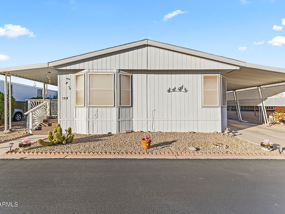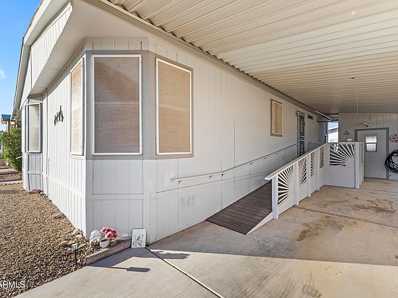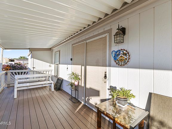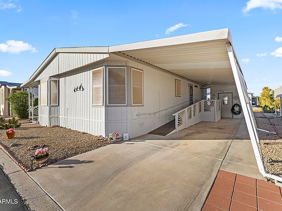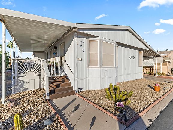 Discover comfort, convenience, and an exceptional lifestyle in this beautifully maintained 2-bedroom, 2-bath manufactured home located in the highly desirable Rose Gardens 55+ Community! This amazing 1,447 sq comes with a beautiful updated kitchen and even comes with a private patio to enjoy those beautiful Arizona mornings! Don't miss out! Community amenities: pool, heated spa, pickleball, shuffleboard, horseshoes, fitness room, dog park, and community room.