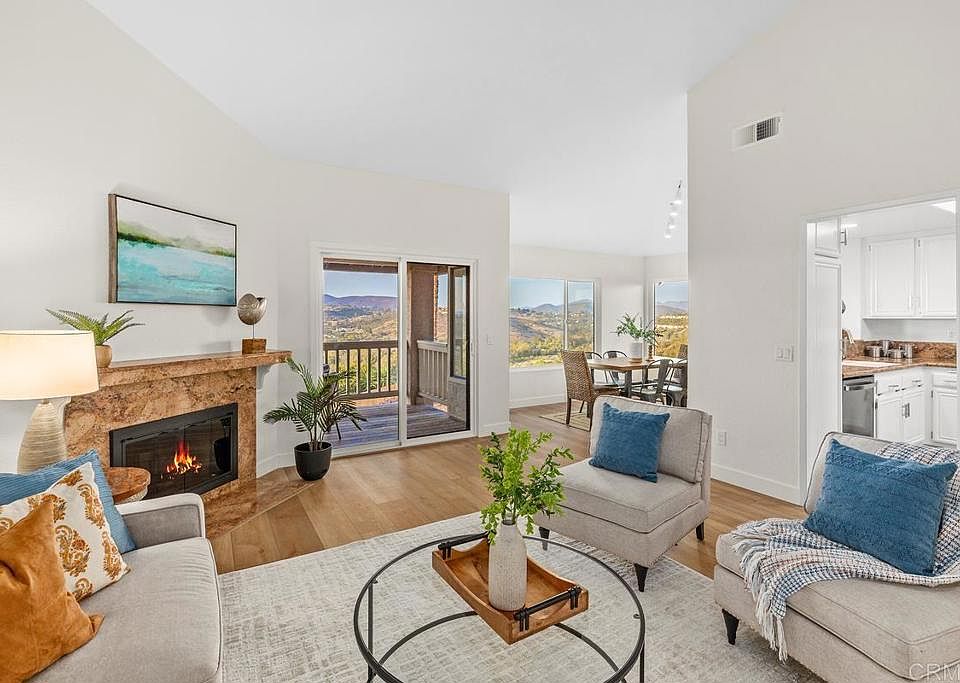 Live immersed in canyon-to-mountain views with a huge level backyard and no neighbors on 3 sides. Tucked at the end of a cul-de-sac, this exceptional property lives like a detached home and overlooks the dramatic landscape of Los Peñasquitos Canyon w/Black Mountain rising beyond. A brand-new Trex deck welcomes you in, leading to a vaulted main level designed to frame the natural backdrop thru oversized new windows & sliders that open to a 2nd view deck—perfect for al fresco dining. A handsome fireplace adds to the ambiance while the adjacent dining area, breakfast nook & updated kitchen offer front-row seats to the view. Kitchen features stainless steel appliances including new range, dishwasher, and microwave. Off the main level, a bonus room w/closet, half bath & deck access makes an ideal office or optional 3rd bedroom. Downstairs, 2 ensuite bedrooms provide a quiet retreat; the primary suite opens to the expansive backyard and features dual vanities, a step-in shower, & cedar-lined walk-in closet. Enjoy new: 9" LVP flooring, designer paint, lighting, bath fixtures, & cedar fencing in the pool-sized backyard. Located in the peaceful Canyon Pointe community with an attached 2-car garage, there are abundant opportunities for outdoor recreation—canyon trails right outside your door, nearby horseback riding, a community park just down the street, and numerous nature preserves all around. Everyday essentials like grocery stores, popular restaurants, & local services are just minutes away, while a short drive connects you to San Diego’s many amenities, including coastal beaches, universities, downtown, and the airport. Termite clearance provided. All this, along with top-rated schools & breathtaking views, creates a lifestyle that’s peaceful & connected. Homes with this rare blend of convenience, privacy, and natural beauty seldom come to market—don’t miss your opportunity. Amenities PDF uploaded to MLS