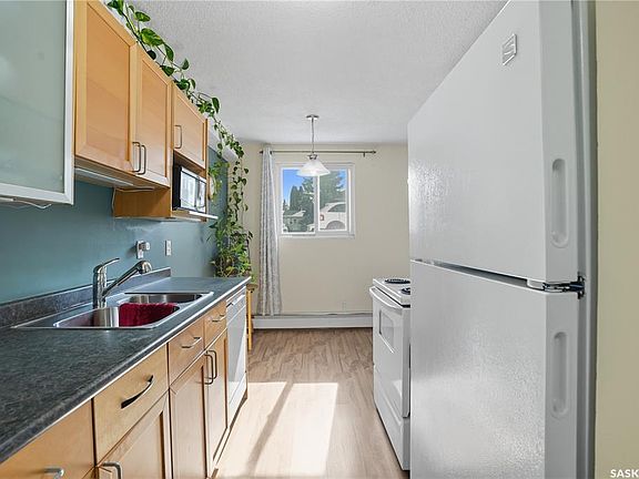 Great West College Park Condo! This bright corner unit condo features two bedrooms, a full bathroom, and an in-suite washer for your convenience, plus a common laundry room just down the hall. The upgraded kitchen and laminate flooring throughout add a modern touch. Includes an electrified parking stall and pet are allowed. Easy access to the U of S, public transit and all amenities nearby—perfect condo for students, first-time buyers, downsizing or investors!