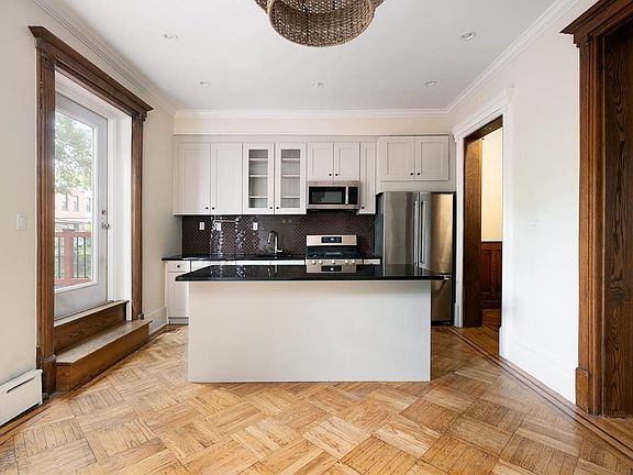 The parlor level welcomes you with soaring ceilings, original inlaid parquet floors, and elegant bay windows that fill the front parlor with natural light. The chef's kitchen, designed with both style and function in mind, opens onto a sunny deck overlooking a sprawling private backyard, perfect for entertaining or quiet relaxation.