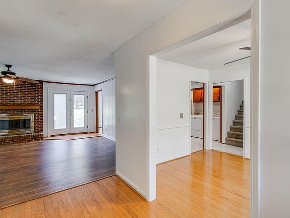 Covered front porchNew carpetAdjoining dining areaLarge fenced backyardTile countersNatural wood cabinetsLaundry space