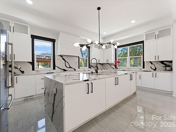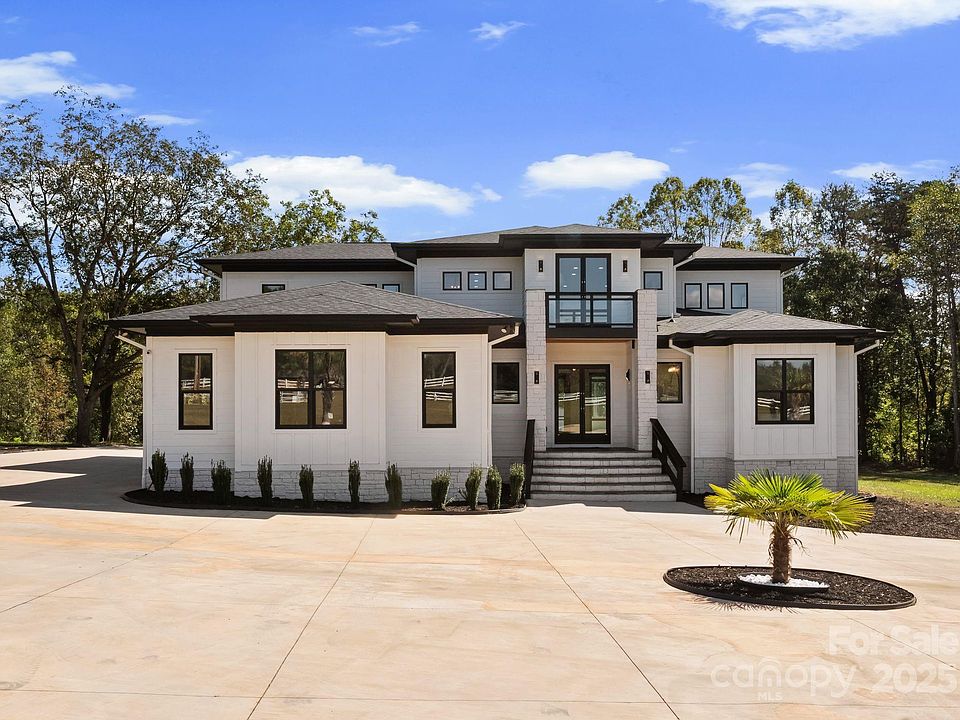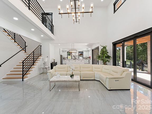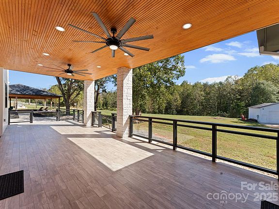 Built in 2023, this modern masterpiece sits behind a private gate on nearly 10 fully fenced acres. The home’s striking design features soaring ceilings, 8’ doors on the main-level, and a two-story living room with folding glass doors that open completely to the outdoors. The kitchen impresses with a sprawling island, beautiful quartz counters, and KitchenAid appliances. Two bedroom suites are on the main level, with the primary upstairs offering access to a huge balcony with sleek glass-metal railings. Spa-like baths feature rainhead showers and a freestanding tub. Outdoor living shines with multiple covered porches, and an oversized pergola—perfect for entertaining. Additional features include epoxy garage floors and a spacious workshop. A rare blend of design, privacy, and functionality on 9.9 serene acres just minutes from the growing I-40/I-77 corridor in Statesville.