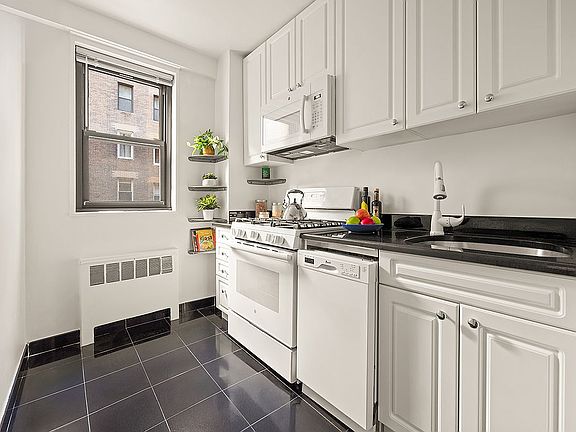 Beautifully updated alcove studioWide plank hardwood floorsClean modern tileworkSleek black countertopsCrisp white cabinetryFull-sized appliancesSeparate windowed kitchen
