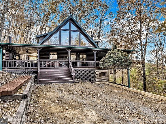 Beautiful log cabin in the woods offering year-round mountain views and stunning sunsets. This spacious home features three finished levels, each with its own bedroom, full bathroom. The kitchen includes custom cabinets, granite countertops, a 5-burner gas stove, French-door refrigerator, convection oven/microwave, compactor, and disposal. Enjoy long-range vistas from the spacious dining room. A dual-zone HVAC system provides comfort on every level. The main and upper-level bedrooms each open to private decks overlooking the mountains, perfect for morning coffee or evening relaxation. Enjoy approx. 1,200 sq ft of covered decking, a wood-burning exterior fireplace with outdoor TV entertainment area, and a brand-new hot tub on the covered porch. The main floor offers a warm, inviting living room with a wood burning fireplace, plus a dining area framed by large windows showcasing the mountain views. The terrace level includes a family room with a gas fireplace and access to another mountain-view deck. The yard is fully fenced, ideal for pets or outdoor enjoyment. This beautiful mountain home comes partially furnished and is perfect for a short-term rental-see Seller's Property Disclosure for a complete list. Conveniently located just minutes from Blue Ridge or Blairsville for great shopping, excellent dining, and year-round events and festivals. Won't last long!