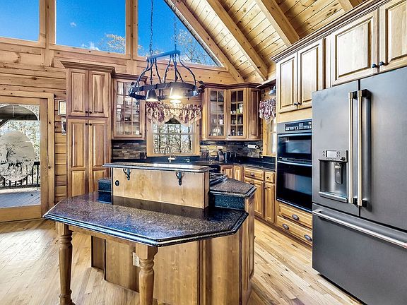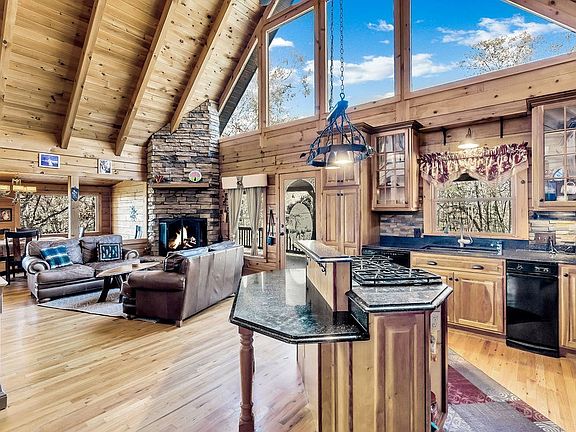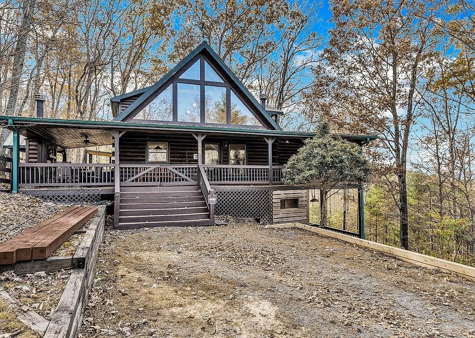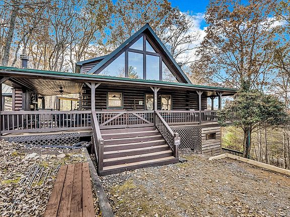 Beautiful log cabin in the woods offering year-round mountain views and stunning sunsets. This spacious home features three finished levels, each with its own bedroom, full bathroom. The kitchen includes custom cabinets, granite countertops, a 5-burner gas stove, French-door refrigerator, convection oven/microwave, compactor, and disposal. Enjoy long-range vistas from the spacious dining room. A dual-zone HVAC system provides comfort on every level. The main and upper-level bedrooms each open to private decks overlooking the mountains, perfect for morning coffee or evening relaxation. Enjoy approx. 1,200 sq ft of covered decking, a wood-burning exterior fireplace with outdoor TV entertainment area, and a brand-new hot tub on the covered porch. The main floor offers a warm, inviting living room with a wood burning fireplace, plus a dining area framed by large windows showcasing the mountain views. The terrace level includes a family room with a gas fireplace and access to another mountain-view deck. The yard is fully fenced, ideal for pets or outdoor enjoyment. This beautiful mountain home comes partially furnished and is perfect for a short-term rental—see Seller's Property Disclosure for a complete list. Conveniently located just minutes from Blue Ridge or Blairsville for great shopping, excellent dining, and year-round events and festivals. Won't last long!