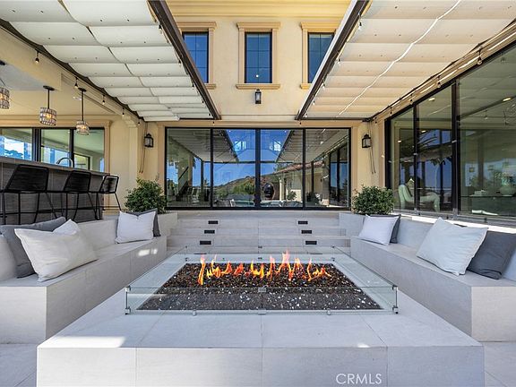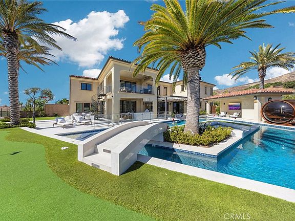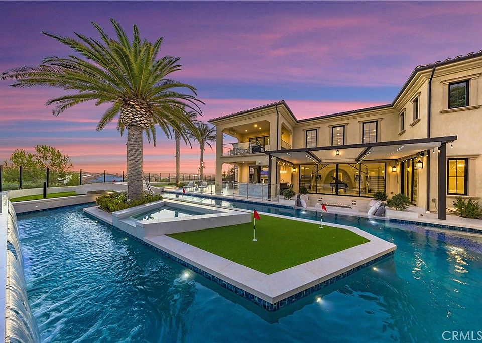 A Private Resort Oasis. Step into a world of curated extravagance, every detail elevates your living experience. The resort-style outdoor haven is a swimmer’s paradise, featuring a lazy river powered by a state-of-the-art Pentair IntelliCenter and commercial River Flow System. Dive into the Olympic-length lap pool, unwind in the glass-tiled jacuzzi, or lounge on the beach-inspired pool bajas beside a mesmerizing infinity waterflow cascading alongside a modern sunken firepit. A curb-frontage lined waterwall and pilaster fountains create a grand, flowing entrance, while lush landscaping, including six Medjool palms and a majestic Canary palm, frames a 30-foot water feature that fountains into the river. For leisure and sport, the estate boasts an in-ground basketball hoop, a putting/chipping green, and a four-hole golf course island accessible via a charming mini-bridge over the lazy river. Indulge in ultimate relaxation within the 7’ Dundalk panoramic cedar barrel dry/wet sauna, complemented by two outdoor showers and a convenient pool house restroom for guests. Fully equipped Alfresco outdoor kitchen, featuring a Sear Zone grill, 24-inch wok burner, and built-in refrigerator, invites al fresco dining under the glow of heated patios, perfect for year-round gatherings with panoramic ocean views. Opulent Interiors Redefining Grandeur. Inside, this architectural gem exudes timeless elegance. Dual gourmet kitchens are a chef’s dream, with the main kitchen showcasing premium Wolf appliances and the prep kitchen adorned with an airy, cloud-inspired quartz backsplash. White marble and natural hardwood floors create a sophisticated ambiance, enhanced by a sleek glass stairwell with contemporary railings.Spa-inspired master bath, fully clad in marble and equipped with 100% Kohler water systems. Five floor-to-ceiling sliding glass doors flood the home with natural light, framing spectacular eastern sunrise vistas and serene ocean views. This ultra-rare private resort estate is a testament to modern luxury, blending cutting-edge amenities with timeless elegance. From tranquil evenings by the infinity waterflow to vibrant gatherings under the canopy, every moment in this home is an experience in unparalleled sophistication. Perfectly positioned just minutes from Irvine’s finest international dining and luxury shopping, and enveloped by top-ranked 10/10 schools, this residence offers a seamless blend of coastal charm, academic excellence, and world-class refinement.