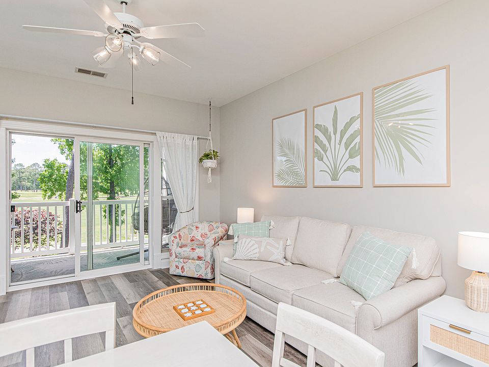 Bright and updated, fully furnished 2BR/2BA condo overlooking the World Tour golf course. Open living/dining with lots of natural light, a well-equipped kitchen, and a private balcony for sunrise coffee. King primary with ensuite, comfortable second bedroom, and in-unit washer/dryer. Elevator building with ample free parking. Enjoy resort amenities: seasonal pool, fitness center, and clubhouse-plus quick access to Hwy 501, Tanger Outlets, Coastal Grand, and the beach. 10 15 minutes to Grand Strand Medical Center and Conway Medical. Utilities, Wi-Fi, and HOA amenities included (per lease). Move-in ready and truly turnkey.