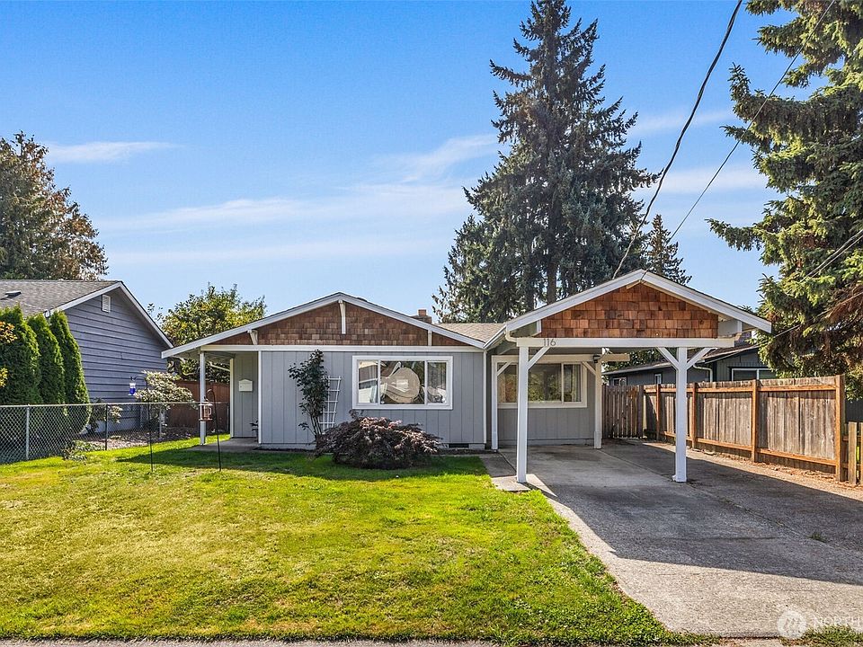 Centrally located in Tacoma just minutes to amenities sits this 4 bedroom 2 bath rambler that has been beautifully updated! Open concept living w/ recently remodeled kitchen + dining area that seamlessly flows into the spacious living rm w/ wood burning fp. Enjoy a smart layout w/ 2 bedrooms + full primary suite + second spacious primary suite complete with an full bath offering dual access from the bedroom/hallway - perfect for multigenerational living or guest privacy. Fully fenced backyard w/ large covered patio perfect for entertaining, raised garden beds, storage shed, carport + cement pad providing parking or future garage plans. Additional features: freshly cleaned roof + fireplace, all appliances convey, turn key!