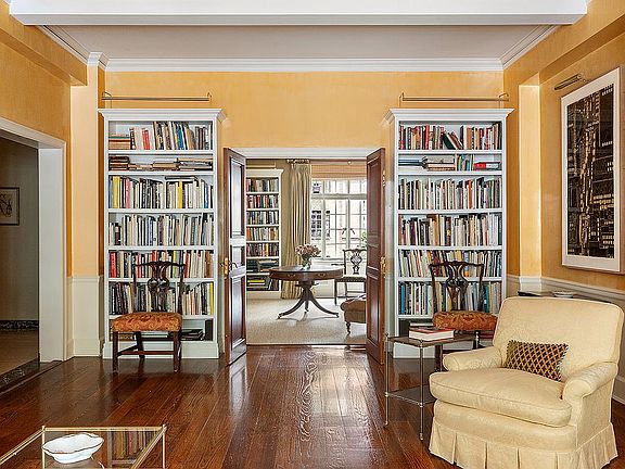 The large, welcoming foyer leads to an enormous living room with a wood-burning fireplace, handsome custom built-ins with oversized casement windows featuring charming verdant tree-lined views. Stunning wood doors open from the living room into the beautifully proportioned dining room, currently configured as a den/dining room with custom built-ins offering an impressive 46-foot expanse, perfect for gracious entertaining. The butler's pantry leads to the sizable eat-in kitchen with two large windows and a washer/dryer. Off the kitchen is a small bedroom with a full bathroom, perfect for a guest room or private study. The generous primary bedroom has multiple closets and an en-suite bathroom.