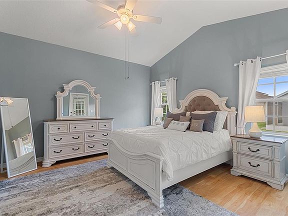 One or more photo(s) has been virtually staged. Corner lot RidgeDale 2/2/Den model has solid-surface floors, granite countertops, well for irrigation and several replacement windows, located 0.2 miles from High Vista private clubhouse and amenities center. Under roof front entry has an overhead domed transom window and full-view storm door with self-storing screen, leading to a bright open central great room with 12 FT ceilings and a wall of patio doors to the north-facing screened lanai. Granite countertops, subway tile backsplash and newly painted cabinets in eat-in kitchen with vaulted ceiling, stainless-steel appliances, built-in desk, large pantry and built-in closet. Cathedral ceiling in en suite primary bedroom with 2 walk-in closets and french door to lanai. Den, with double-door entry from Great Room, is nestled between primary and guest bedrooms. Newer interior paint, hardware, electrical outlets, smoke detectors, some ceiling lights & fans. Corridor access laundry has washer & dryer, storage closet and utility sink. Garage has epoxy floor, reinforced garage door with keypad entry, freestanding and overhead shelving. Water heater replaced 2025. Roof recently inspected. HVAC replaced 2011; HVAC condenser fan motor replaced 2025. Sold As-Is. Ridgewood Lakes is a golf cart friendly community. $230 monthly High Vista HOA fee includes Spectrum internet and basic cable TV with 2 cable boxes, lawn mowing and exclusive access to resident-owned 12,000 SF private High Vista clubhouse and amenities. $425 semi-annual Ridgewood Lakes HOA fee provides 24x7 staffed security gate and master association-owned private road maintenance. Adjacent to 18-hole White Heron Golf Club with The Nest restaurant, privately owned and open to the public. High Vista is a 55+ community with outdoor heated pool and spa, fitness center, library, pub & many organized activities. Pickle ball, tennis, bocce and shuffleboard courts. Miles of biking and walking trails within Ridgewood Lakes gated community. Shopping, Disney, Universal, Orlando & Central FL entertainment nearby, easy access to I-4, medical facilities, airports & Sunrail Station. Advent Health hospital is 3 miles away.