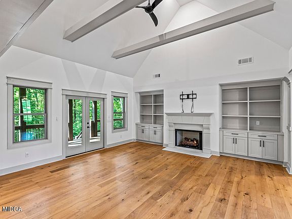 The heart of the home is the expansive great room, showcasing built-ins, high ceilings with exposed beams, and opens to the covered back porch with a cozy fireplace, perfect for year-round outdoor enjoyment.