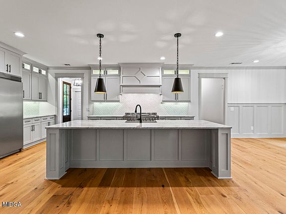 The chef-inspired kitchen is a culinary delight, featuring an oversized island, sleek countertops, and a walk-in pantry.