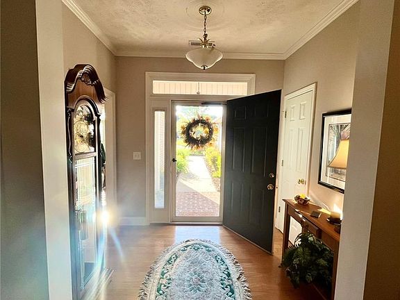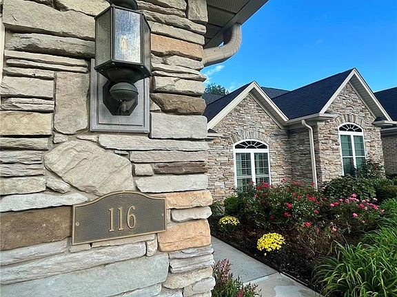 Discover the epitome of elegance with this brick and stone condominium, featuring two cozy bedrooms and two full bathrooms. The heart of the home is an open floor plan that seamlessly connects the kitchen, living room, and dining area, all accentuated by matching crown molding that gracefully frames the windows and fireplace. Step outside to the screened back patio and indulge in serene views of a tranquil koi pond and lush forest. The ensuite bathroom is a haven of convenience with ample counter space and drawers, while the primary bedroom is adorned with sophisticated cornice window treatments. Practicality meets luxury with an adjoining laundry room leading to a spacious two-car garage, complemented by additional attic storage. The property's exterior is just as impressive, boasting a picturesque koi pond, and vibrant front garden flowers. Nestled in a modern and private neighborhood, this home is a sanctuary of modern living.