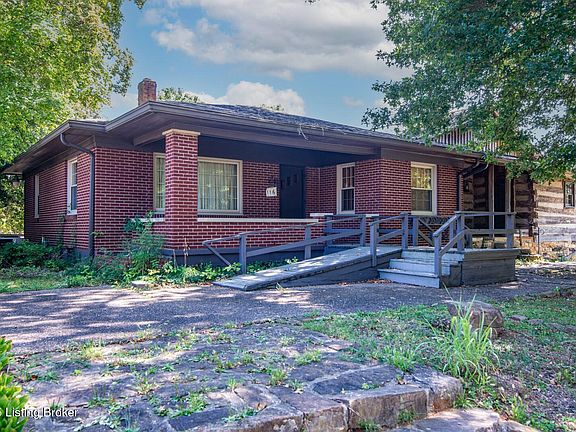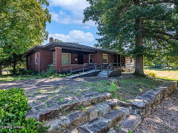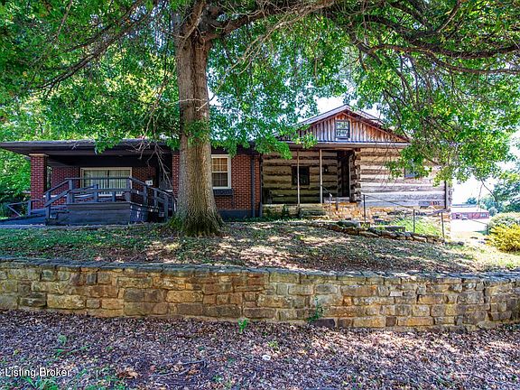 Discover a truly unique property where charm meets character on nearly 3 acres within the city limits of Vine Grove. This distinctive home combines the warmth of a traditional brick home with the rustic appeal of a log cabin addition, creating an inviting blend that's sure to catch your eye. Step inside to find over 4,000 square feet of thoughtfully designed living space. The impressive great room serves as the heart of the home, featuring soaring ceilings, generous windows that flood the space with natural light, and a striking stone fireplace that reaches from floor to ceiling. Whether you're hosting friends or enjoying a quiet evening, this wood-burning focal point creates the perfect ambiance. The spacious open kitchen flows seamlessly into daily life, while formal dining and living rooms provide elegant spaces for special occasions. Two comfortable bedrooms occupy the main level, with a third bedroom tucked away upstairs for added privacy. Practical touches abound, including a large main-level laundry room complete with utility sink, plus an additional laundry area in the basement for ultimate convenience. The finished walkout basement extends your living options with daylight windows, attractive wood plank ceilings, and a generous family room perfect for recreation or relaxation. A convenient breezeway connects to the spacious two-car garage. Outside, stone hardscaping and a circular driveway enhance the property's curb appeal, while the home's generator provides peace of mind. Located adjacent to St. Brigid church, this property offers both tranquility and community connection in a truly special setting.
