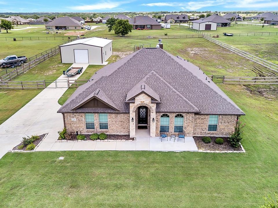 LIVE IN THE COUNTRY! This stunning home on a specious 1 acre lot offers the best of both worlds with peaceful country living just minutes from city conveniences & an easy commute! Open concept floor plan with an abundance of light lending a relaxing ambiance to each room! Study off the entry! Well appointed island kitchen with granite counters & SS appliances! Warm & welcoming living with hardwood tile plus a focal point stone FP & built ins! Private Master retreat with spa-like bath! Large secondary rooms with walk-in closets! Extended back patio is the perfect venue for grilling out or taking in the serene view of the sweeping TX sky! HUGE 30'x40' shop with electric offers plenty of room for hobbies or toys!