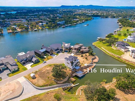 **PRICE IMPROVEMENT !** HOUDINI WAY at LEGENDARY ESTATES - quickly becoming one of the most prestigious addresses on Lake LBJ ! This newly completed modern contemporary home features 4 bedrooms 4 1/2 baths + study with 72 feet of Lake LBJ Waterfront. Modern, minimalist design with an open plan featuring a large party deck overlooking your private pool (just completed)l and boat dock (just completed) area with scenic views of Lake LBJ and the surrounding Hill country. 116 HOUDINI WAY is loaded with luxury and exquisite finishes & features such as the incredibly efficient HVAC system with separate whole-house de-humidification and allows for every main space, bedroom, and hallway to be individually controlled. 3 story foyer area with mono-spine steel floating staircase with white oak stairs and discreet underside recessed LED lighting. A 3 Stop, dual door hydraulic elevator serves all 3 floors. The gourmet kitchen features floor to ceiling handmade cabinets, "Z-LiNE" kitchen appliance package, KOHLER plumbing fixtures throughout, recessed LED lighting with posh accent and pendent lighting from KICHLER, MOD, MODERN FORMS, EUROFAZE, and ZENDUCE. Sync your phone & create your own music and light show ! 3rd floor (sky floor penthouse) features a gym/study/workout room with "lookout patio" atop the highest viewpoint in the neighborhood. "What a Houdini Way to Work From Home !"