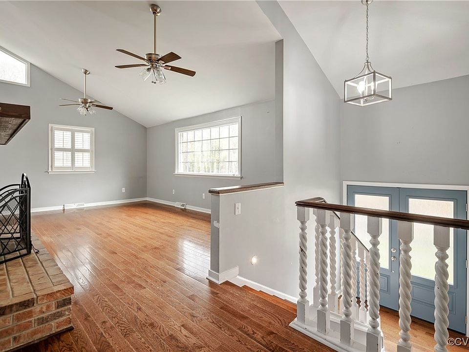 - Description: Hardwood, brick hearth and f/p, 2 fans w/ light