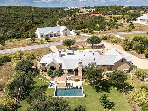 Welcome to 116 Marquise, a breathtaking oasis of luxury and tranquility nestled on 3 sprawling acres that promise an unrivaled lifestyle of comfort and style! Located in the highly desirable and gated community of Diamond Ridge, this exquisite one-story custom designed and constructed home (with a bonus room above the garage) spans approximately 4,200 square feet, featuring four bedrooms (one can be used as an office or bedroom) and four bathrooms, meticulously designed to cater to the most discerning tastes. From the moment you arrive, you'll be captivated by the stunning hill country views that set the backdrop for this amazing home. The home's exterior, an attractive combination of stucco and native limestone, was recently painted, while the standing seam Galvalume roof, gutters and downspouts add both elegance and durability to the curb appeal. The solid black metal double front door with privacy glass also sets the stage before entering! The interior is equally impressive, boasting an open floor plan that seamlessly integrates the kitchen and living room, creating an inviting atmosphere for both entertaining and everyday living. The kitchen is equipped with a built-in extra wide, double door stainless steel Whirpool refrigerator, built-in stainless steel oven, a stainless gas cooktop, a classic farmhouse sink, exquisite granite countertops, all accented by light knotty alder wood cabinetry, as well a secondary veggie sink and walk-in pantry The architecturally exposed beams in the family room highlight the vaulted ceiling design, while the massive limestone arched wall leading into the kitchen is a major statement feature. The primary bedroom is spacious and offers a spa-like experience in the bathroom with a private walk-in shower, a jetted tub, double vanity and an over-sized walk-in closet with multiple built-in features. The two main guest bedrooms are located on the opposite wing from the primary bedroom and one of them enjoys its own luxury bathroom. The residence's allure extends beyond its living spaces. Movie enthusiasts will delight in the dedicated movie theater, offering an authentic cinema experience at home with surround sound and movie theatre style chairs that are negotiable. A large bonus room above the garage serves as the perfect space for a game room or workout area. The laundry room is more than spacious and offers extensive cabinets and another sink. Now it's time to talk lifestyle! Outdoor living is elevated to new heights with a large covered back patio with a floor to ceiling stone fireplace overlooking the magnificent heated Keith Zars pool with a beach entrance and spa, creating a resort-like ambiance. The views off the back patio go for miles so if you like colorful sunrises, get your coffee ready and enjoy the show! The private fire pit, located beyond the pool, is yet another superb feature that allows for star gazing and s'mores! The side loaded three car garage offers tons of space and has an epoxy flooring (as well as hanging racks). The buried propane tank allows for gas cooking, gas logs in each of the two fireplaces and heating the pool, while the large concrete water storage tank was also recently painted seamlessly blends in with the house. There is even a hidden armory that offers a secure place to store valuables. If all of that wasn't enough, there is a private pond, full of fish, along with the pickle ball and tennis courts located with in the community owners can take full advantage of. 116 Marquise is not just a residence but a sanctuary, offering long-range hill country views and a lifestyle of unparalleled luxury and serenity. If you are looking for a gorgeous Texas Hill Country home with great views, a seamless floor plan, an oasis backyard, in a highly desirable gated community and just 8 minutes to town, you need to put 116 Marquise on your short list!