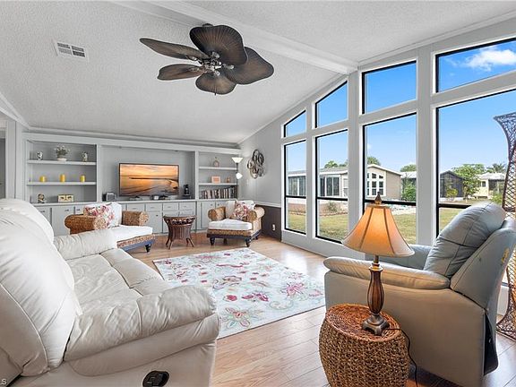One of the many features in this home is being able to enjoy the long water view from the living allowing plenty of natural light while creating a homey feeling. Then there is the spacious side lanai with another water view that is great for entertaining or spending a relaxing evening with friends. The open kitchen has plenty of cabinets and counter space and a slider window that allows for a quick pass through to the lanai. The wet bar off the kitchen/family area is a bonus – be sure to check out the new ceiling addition when you are there. The interior has been freshly painted, remodeled master bath that features a luxurious soaking tub and separate walk-in shower. Attention has been paid to details in this 2 bedroom 2 bath home adding a variety of finishing touches. Homes with a water view are not always available in this 55 plus community so you will not want to miss your opportunity to view this home. Close to shopping, dining, 5th Avenue and the Naples beaches. Low monthly fees of $133.00 a variety of social activities, water aerobics, pickle-ball, tennis, and other amenities are all benefits to being part of Windjammer Village of Naples.