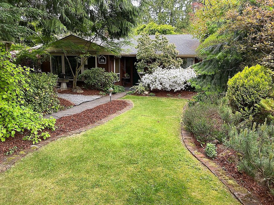 MId-century 3-bedroom rambler on a large lot. The gardens and plantings are mature, with rhododendrons, maples, western red cedar and other deciduous and fruiting trees. There is a large patio with a fire bowl area, pond and vegetable/herb garden. An attached garage with storage and a workbench provides covered parking for one car, with a long driveway and large gravel parking area off the street. The back yard has a fish pond and a custom-built shed with a patio and loft.