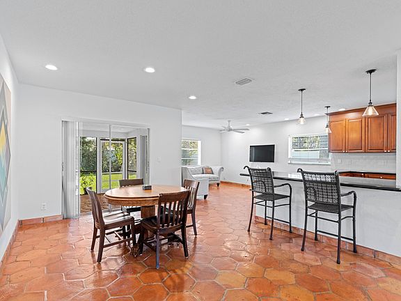 Step inside to a bright, open floor plan with natural light flowing through quality tile flooring and contemporary LED lighting. The heart of the home is the stunning eat-in kitchen featuring rich cherry-wood cabinetry, dark granite countertops, a spacious island with pendant lighting, and stainless steel appliances. Distinctive terracotta tile adds Mediterranean charm, and large windows fill the space. A pantry offers storage, and an adjacent dining room suits formal occasions. The spacious primary bedroom provides a tranquil retreat with a walk-in closet and a spa-inspired en-suite bathroom boasting a glass-enclosed steam shower, elegant beige marble/travertine tile, a modern backlit vanity mirror, and built-in storage. Embrace Florida living with multiple outdoor entertaining areas, including a screened patio, a covered patio, and a huge fenced backyard awaiting your personal touch.