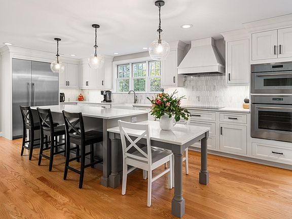 They say the kitchen is the heart of the home....this thoughtfully renovated & expansive gourmet kitchen is also a chef's dream. From the luxury Thermador appliances, including an induction cooktop, double ovens & farmhouse sink to the oversized island with 2 levels, perfect as a baking station; this kitchen is magnificent. The open plan flows seamlessly into the dining room with a stunning built in wet bar & wine fridge - perfect for entertaining. The spacious living room features hardwood floors, as does most of the 1st floor. At the far end of the kitchen, you'll find a 1/2 bath, laundry room & a slider allowing easy access to the deck & the fenced in side yard. At the front of the home is the office, with 2 custom built in desks, shelving & a window seat - great for those who work from home!