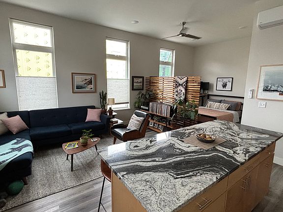 This newly constructed condo is located in the Two Rivers development, across from Liberty Hall and Mojo's. It is a first floor, end unit condo with amazing light thanks to the floor to ceiling windows. It feels larger than it's 590 SF, with 10-foot ceilings and open layout. Included is a 400 SF patio and detached 1-car garage. If you're like me and use the garage for gear, there is also a reserved parking spot. Well-behaved dogs are allowed. No cats. No smoking.
