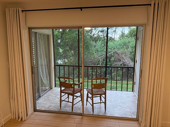 Enjoy picturesque views overlooking lush trees and a spacious grassy area from both the master bedroom and your private screened balcony. Linen blackout curtains over patio doors provided.