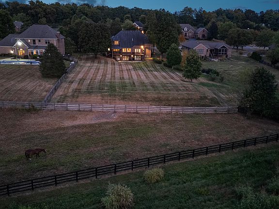 Experience the charm of country living with the convenience of city access! This beautifully crafted custom home sits on a serene 1-acre lot backing to a picturesque horse farm, offering stunning sunsets and tranquil views. Step into a grand 2-story foyer and take in the open, airy floor plan adorned with rich redwood trim and beams. The first-floor primary suite is a true retreat, featuring an updated spa-like bathroom with heated tile floors, a custom vanity and walk-in closet. Designed for both daily living and entertaining, the home boasts a custom bar area, screened-in porch, and a full-length deck overlooking the backyard and horse farm. A walk-out basement with patio and is perfect for a workshop or future finished space. The laundry room includes extra cabinetry, while a back foyer adds bonus storage. Upstairs, a large flex room could serve as a 5th bedroom, home office, or playroom, complemented by an additional bedroom with private bath plus two additional bedrooms and full bath. All of this is just minutes from Versailles, Lexington, Keeneland, Blue Grass Airport, and Champions Golf Course. Don't miss the professional landscape lighting and thoughtful details throughout this one-of-a-kind home!