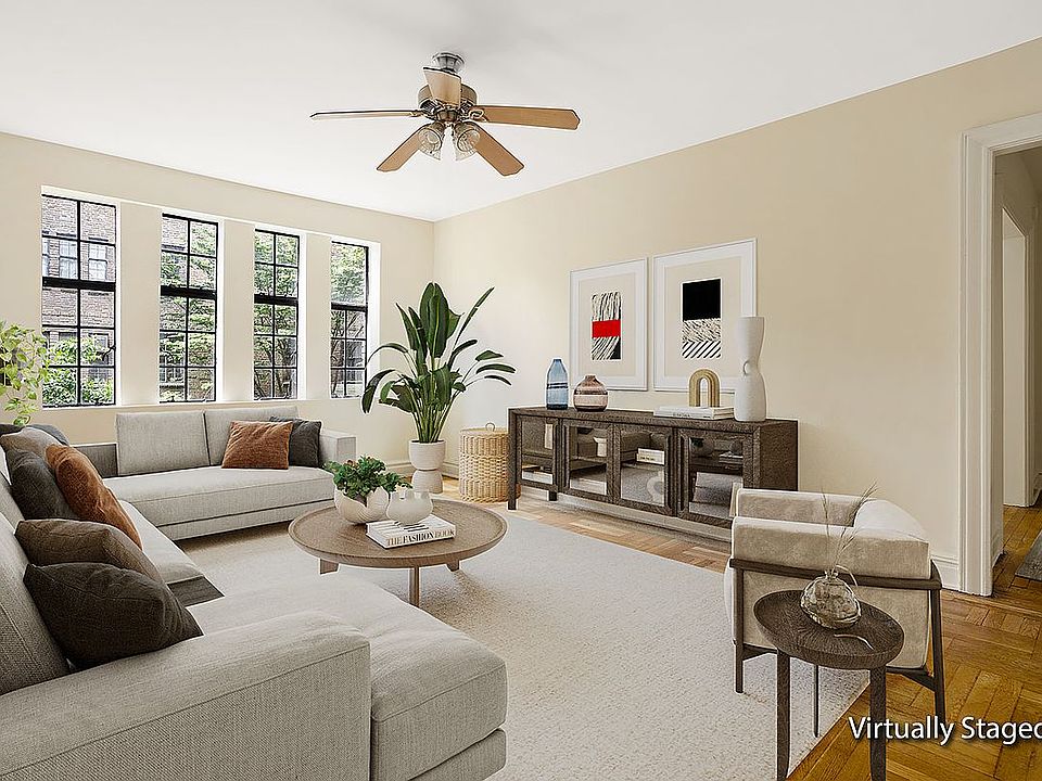 Sun-flooded, south and east facing 4-room home in desirable Hudson View Gardens. F25 is one of the most versatile apartment lines in the co-op as is reflected in the multiple floor plans shown in this listing. This 2nd floor home in the elevatored F building is currently configured as a one-bedroom home with a large foyer, Kitchen, full dining and living rooms along with 5 closets, one of which is a huge walk-in that was originally the Murphy Bed. This is a sweet space awaiting a new owner with a vision. The home is perfectly inhabitable but does need a little TLC to make it shine. Come see. Make an appointment today! Photos are virtually staged.