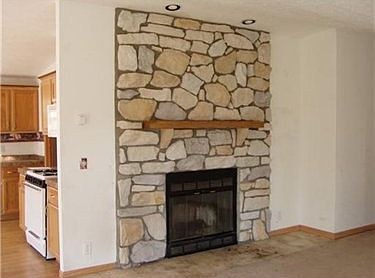 Eat-in kitchen. open floor plan, fireplace in living room.