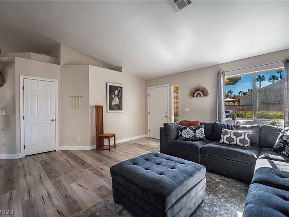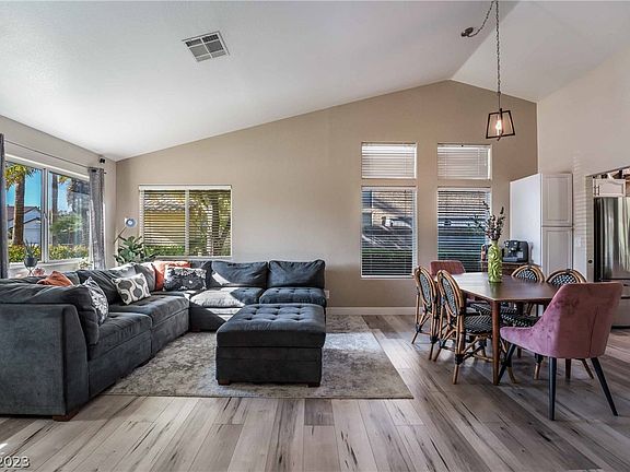 Home Sweet Home! Lovely Single Story 3 bedroom 2 bathroom in the highly desirable Palm Canyon community in Henderson. Located nearby the 215 highway and several shopping centers. Vaulted ceilings greet you upon entry. Airy open floor plan with a dual sided gas fireplace in the family/living room. No Carpet! Beautiful low maintenance laminate throughout the entire home. Vinyl in the wet areas. The kitchen has a breakfast bar with quartz and floating shelves. Oversized primary bedroom with dual sinks, separate tub and shower. All appliances are staying including water softener and ring door bell/cameras. Enjoy your covered patio and low maintenance yard. Roof & HVAC recently serviced. Water heater less than 2 years old. Ready for you to call HOME!