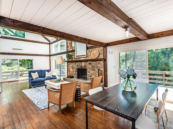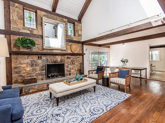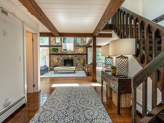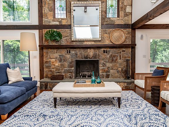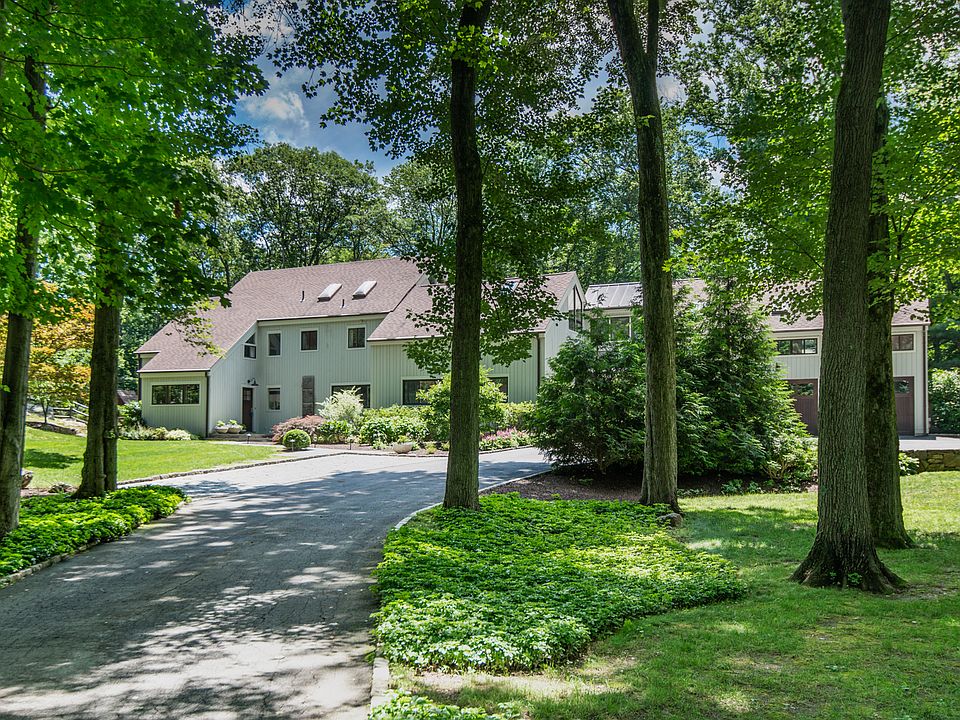 Modern, rustic custom-built post & beam gem on beautiful Round Hill Road. Open floor plan with fabulous living room with exposed beams, stone fireplace and wide plank floors. Updated kitchen with Subzero/Dacor/Thermador appliances open to great room with built-ins and Marvin glass sliders out to deck overlooking Koi pond with waterfall. Recent updates include new siding, gutters, skylights, doors, windows, appliances, three HVAC units, full house 20kw generator, propane furnace, 1,000 gallon propane tank and extensive landscaping. Great master suite. Finished walk-out lower level with playroom, nanny's room and full bath (lower level square footage included in total plus additional 768 square feet in newly finished studio above garage with powder room) .1 acre of property is in Greenwich - 1 Edgar Road, Greenwich, CT.